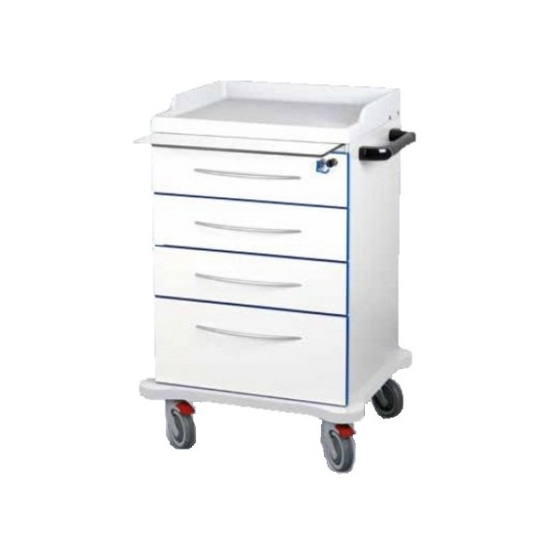 Carrello medicazione in laminato plastico a bassa emissione di formaldeide classe E1 con 4 cassetti,  4 ruote di cui 2 bloccabili.