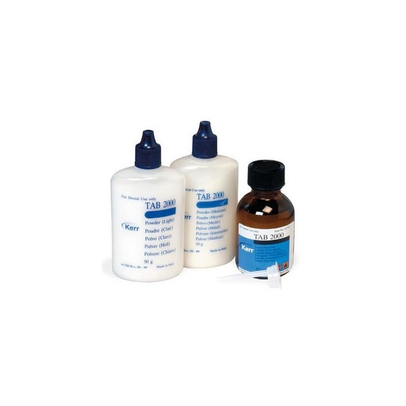 TAB 2000 LIQUIDO FAST SET flacone da 50 mlPOLVERE MEDIA flacone da 50 grResina autopolimerizzante, per la realizzazione di ponti e corone provvisori. Presenta un'elevata resistenza, una bassa contrazione ed è facilmente amovibile.