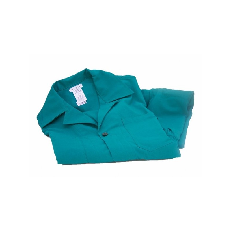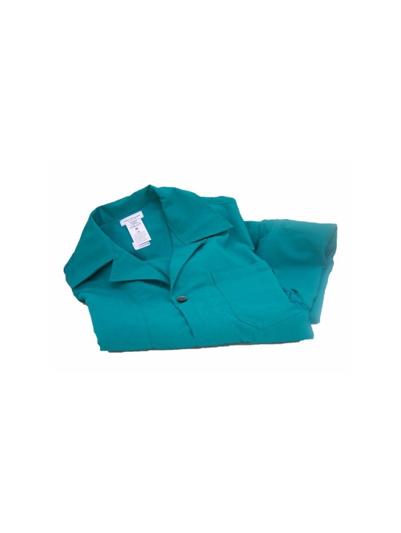 Tuta intera in cotone 100% di colore verde, mezza manica ed elastico in vita. Chiusura anteriore tramite cerniera centrale coperta e bottone all'estremità superiore. 6 tasche di cui 2 al petto applicate, 2 sulle maniche applicate e 2 anteriori.