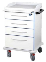 Carrello medicazione in laminato plastico a bassa emissione di formaldeide classe E1 con 4 cassetti,  4 ruote di cui 2 bloccabili.