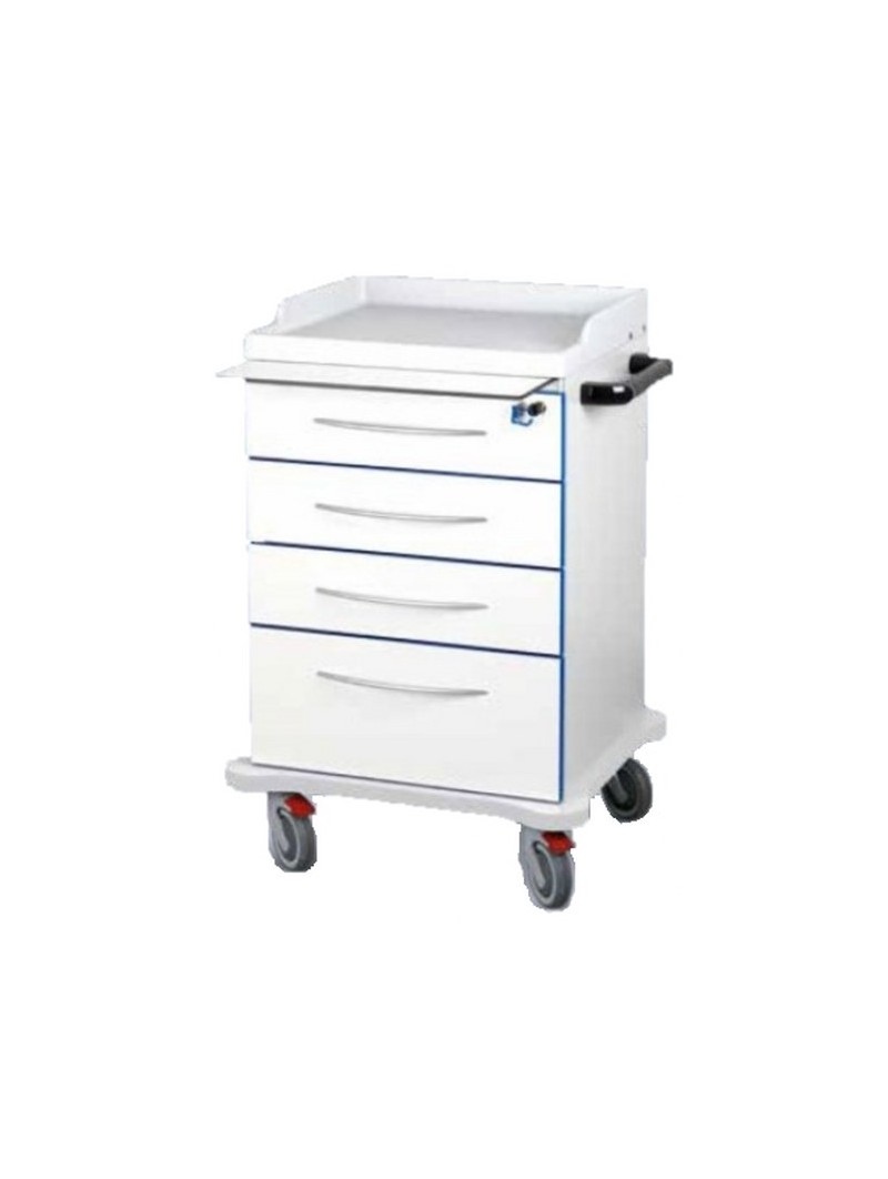 Carrello medicazione in laminato plastico a bassa emissione di formaldeide classe E1 con 4 cassetti,  4 ruote di cui 2 bloccabili.